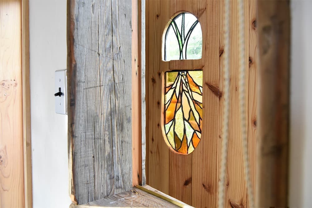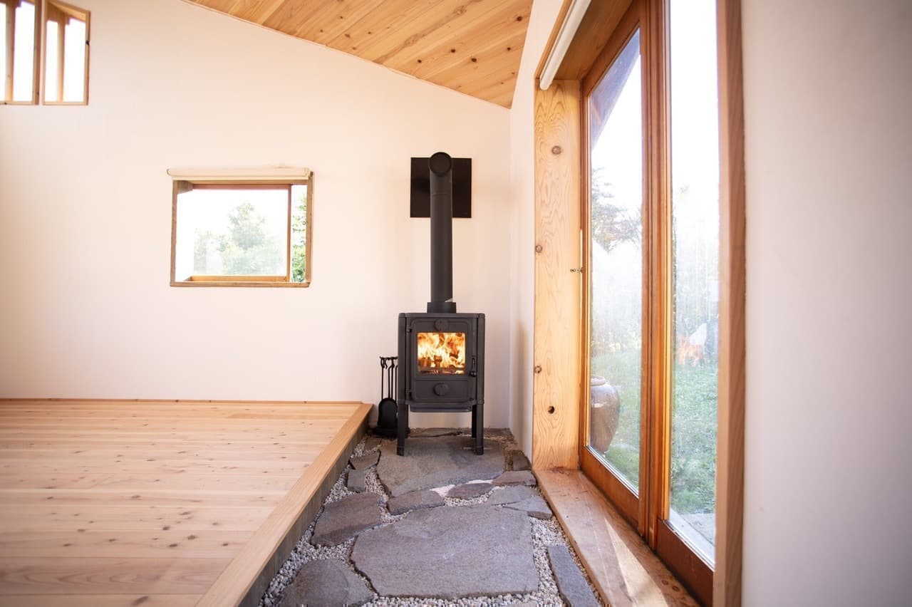 鉄平石の土間には小さな薪ストーブを設置しました。梯子で上れる瞑想スポットも!?