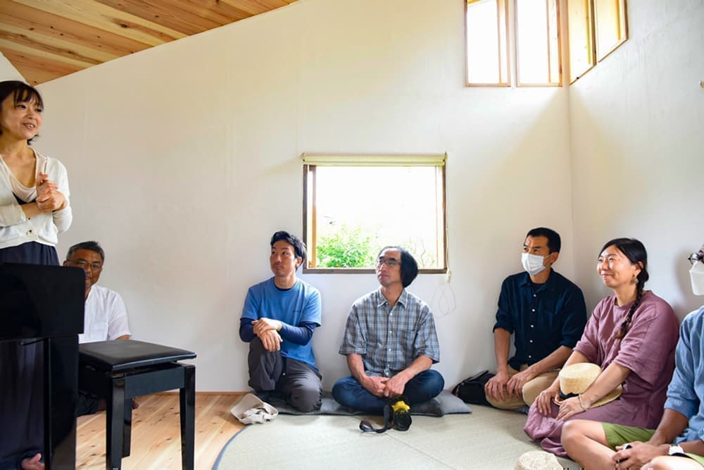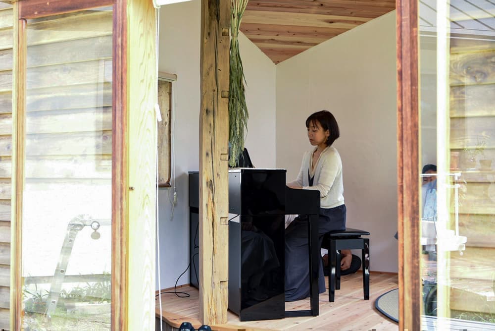 竣工式の”音霊入れ”。ピアニストの福井真菜さんがドビュッシーを奏で、小舎づくりのスタッフに捧げました。